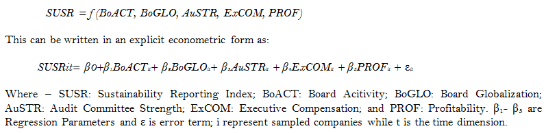 In order to achieve the objective of the study, a linear and multivariate regression model which expresses sustainability reporting as a function of company governance structure is stated in functional form as follows: